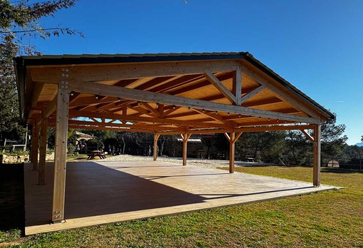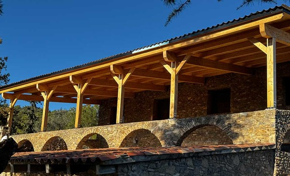 Pèrgoles de fusta de pi roig tractada a l’autoclau amb classe de risc norma 4, peces foradades i